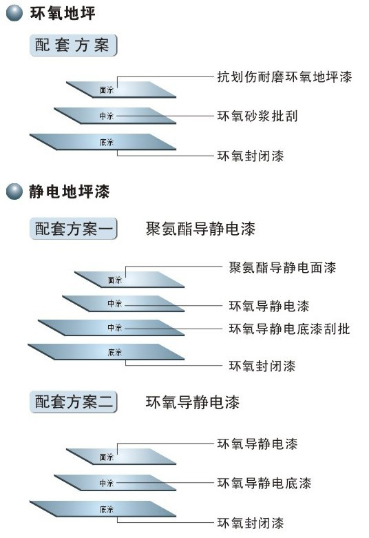 工業(yè)建筑物中的車間混凝土地坪經(jīng)常采用涂料進行防腐蝕涂裝,依據(jù)地坪的承載荷要求和腐蝕環(huán)境選擇不同的涂料產(chǎn)品。一般來說工業(yè)地坪防腐蝕涂層受各種機械作用外,還或多或少受水分和各種酸堿鹽介質(zhì)的腐蝕作用,所以需求地坪涂層有高度的耐腐蝕性能、機械強度好、耐磨性、抗沖擊性和耐水性好。右圖是我公司工業(yè)地坪防腐涂層基礎(chǔ)性配套方案,依據(jù)不同的防護年限、腐蝕環(huán)境和承載荷能力設(shè)計不同的涂層厚度。